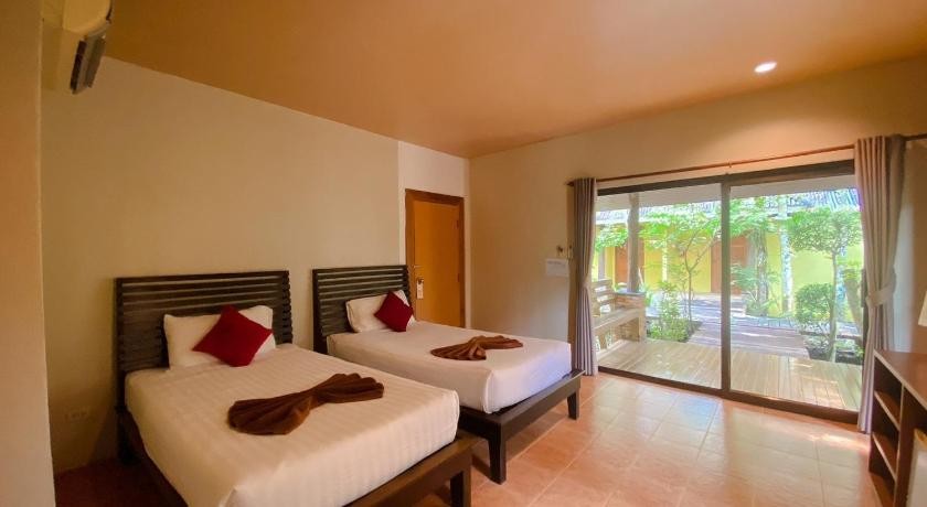 Вдвоём с мужем 2 недели с 24.02.25. 7 по счету поездка в Тай. После Пхукета, Самуи и Патайи захотелось чего то " этакого". Из а/п Пхукета добрались на трансферелтличный большлй джип), который заказывали заранее из дома за 2500б. К слову заказать трансфер от турагенства-3700б. Я списывались с ребятами через соц.сети по машине. По итогу, обратно домой возвращались через такси Bolt за 1800б бат. Без всяких проблем. Приехали в 9 утра, а заселились только к 14.00, отель был заполнен. Первый день: сплошные разочарования, потом привыкли, общались и стало все вполне нормально. Плюсы: большлй номер, огромная ванная комната,зелёная территория, как в глухих джунглях, тишина, белки, птицы, бабочки.Отличная кровать, кондер , хороший напор воды в душе, новая сантехника,хороший современный телевизор, есть фумигатор в номере, отличная уборка, отличный ароматный шампунь, жидкое мыло. Минусы: нет полотенца для рук( 1 банное и 1 на пляж), нет нормального шкафа, тумбочки-но мы привыкли. Розетки где-то под кроватью, нет шторки в душе, нет полочки для шампуня, неудобно на полу всё держать. На территории есть 2 небольших бассейна. У каждого всего по 4 лежака. Завтраки стандартные тайские, накормить и себя и ребёнка без проблем. Есть курица, рис, лапша, сосиски, яйца, овощи, выпечка, фрукты. Плохой растворимый кофе( как и везде в Тае), хороший чёрный чай. До пляжа пешком около километра ,с 9.00 до 21.00 каждые 2 часа можно бесплатно в одну сторону от отеля на шаттле уехать до любой точки Аонанга. Это просто супер бонус! На рецепшн можно сдать вещи в стирку, заказать, доп.трансфер, купить, воду, заказать массаж( салона как такового нет). Отелем остались очень довольны. Рекомендуем!!